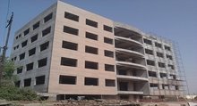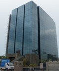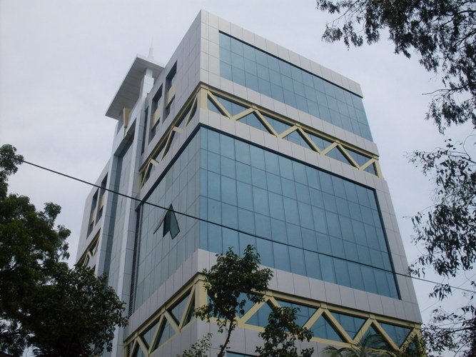 A nine floor's commercial building by CONCRETE BUILDERS with beautiful Elevation design. 15000 Sft Semi unitized Glazing with 48,000 sft ACP Cladding work, Fin Supported Suspended Glazing in Double height Entrance lobby & Internal Aluminium Window work.